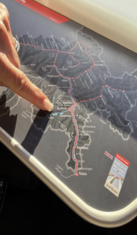 On Thursday, after three days of skiing twenty-four of us took a train to Tirano, Italy. To tell you the truth, the skiing was so good that I was tempted to follow my ski buddy’s’ example and to skip the trip to Tirano. Thank God, I did not do it!! The views across the mountains and glaciers were truly stunning. We were also impressed by the engineering feat that made the Red Train possible with the numerous bridges, tunnels and viaducts through the mountains. To understand the unique experience we went through, here’s some interesting facts about the Red Train: The train follows the Bernina Pass, and it is the highest Alpine crossing (reaching an altitude of 2250 meters) and the steepest rail route in the world. The route is one of very few in the world listed as a UNESCO world heritage site.